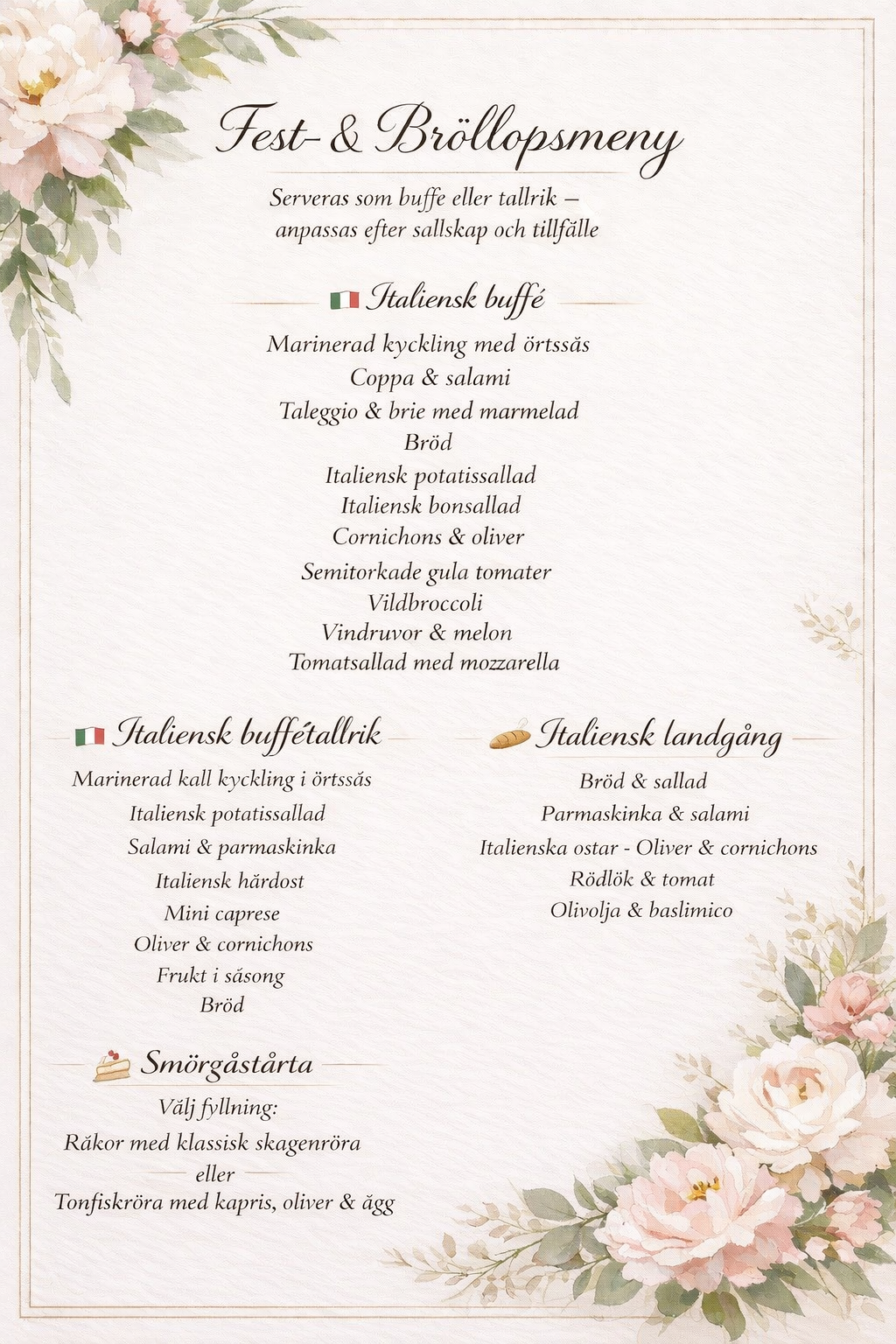 Vår cateringmeny är skapad med inspiration från det italienska köket och innehåller rätter som passar både vardagslyx och fest. Vi tillagar all mat från grunden och anpassar gärna upplägget efter dina behov oavsett om det gäller kalas, dop, födelsedag, företagslunch, begravning, minnesstunder eller bröllop.